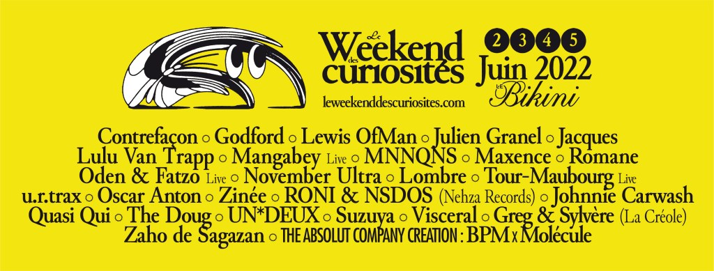 Samedi 4 juin : Contrefaçon – Godford – Greg & Sylvère – Julien Granel – Lullu Van Trapp – Maxence – Oscar Anton – Quasi Qui – Suzuya – The Doug – u.r.trax – Zaho de Sagazan – Zinée